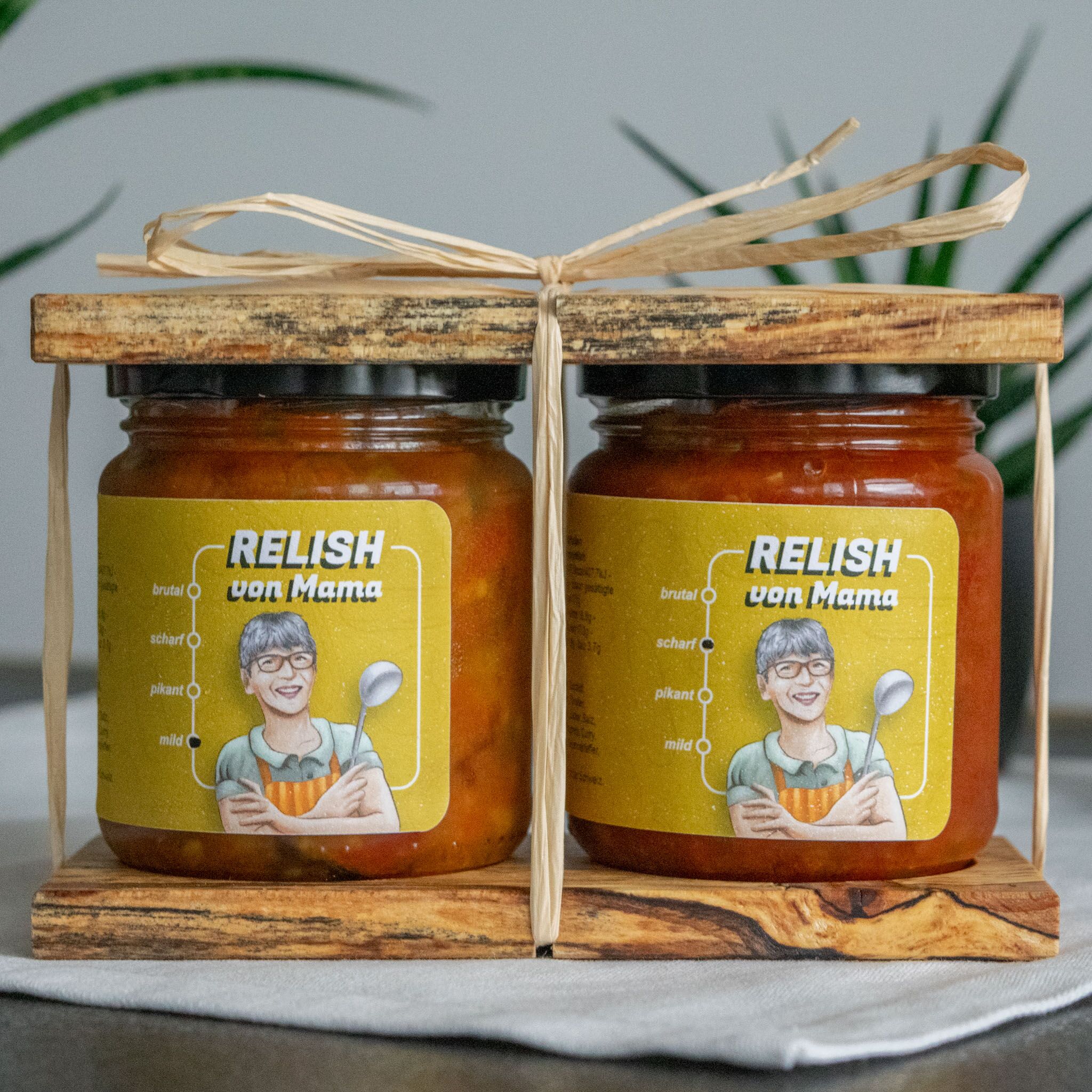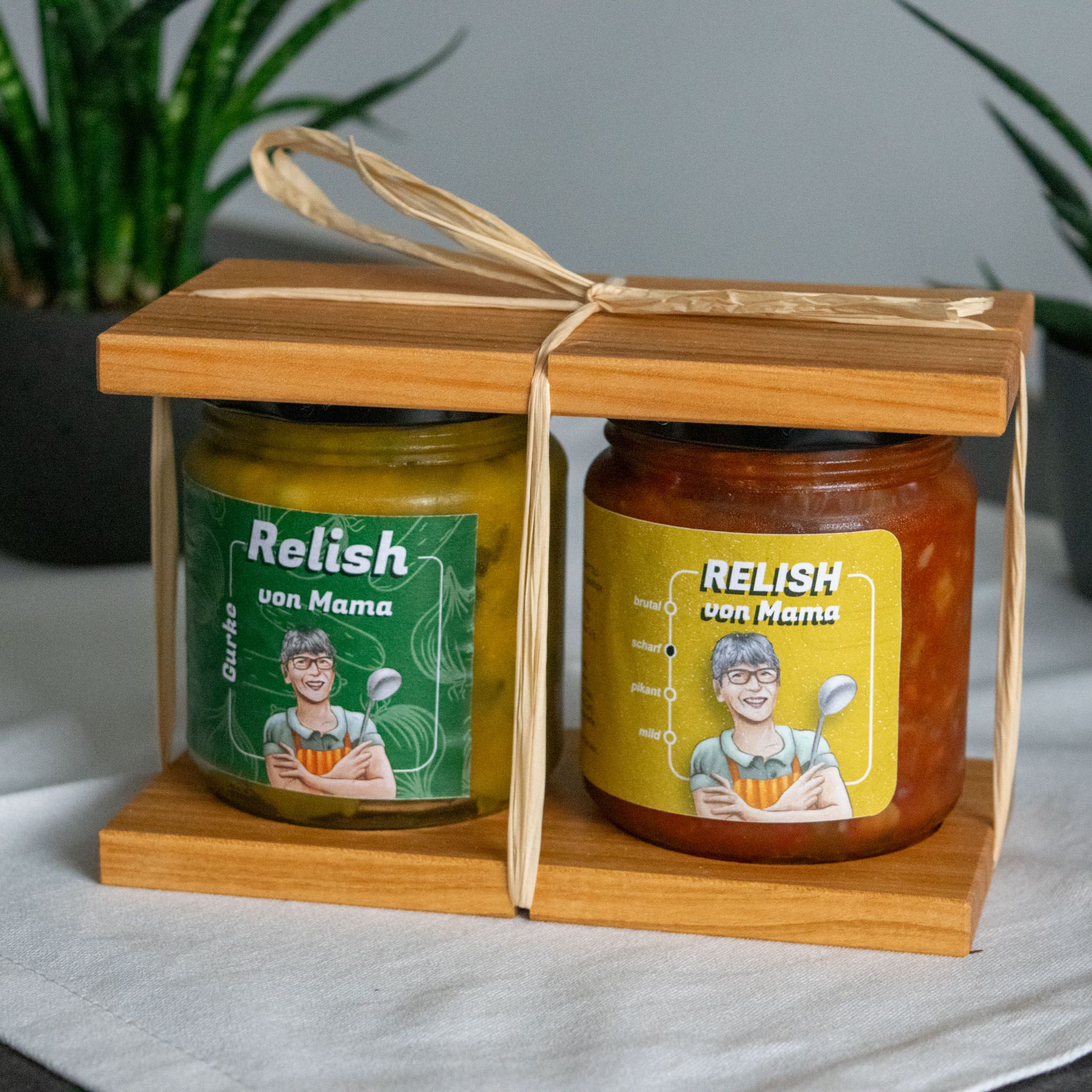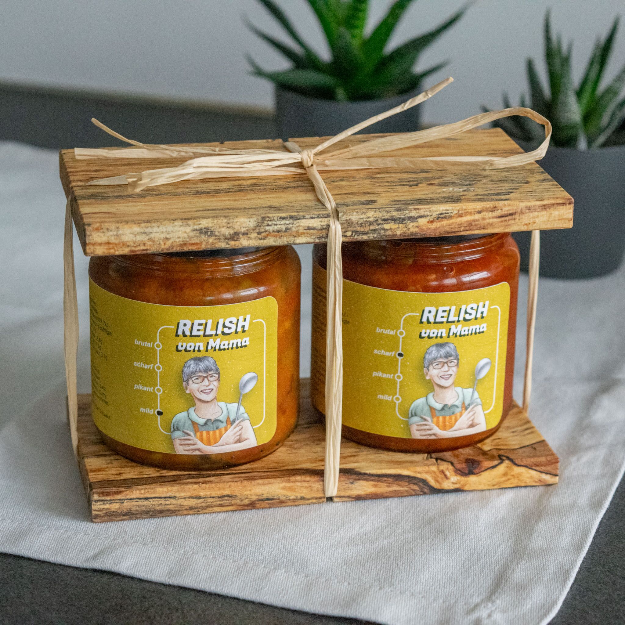 Die beiden Gläser werden stilvoll zwischen handgefertigten Holzplatten der Stiftung Weizenkorn aus Basel fixiert und mit Naturbast verpackt.