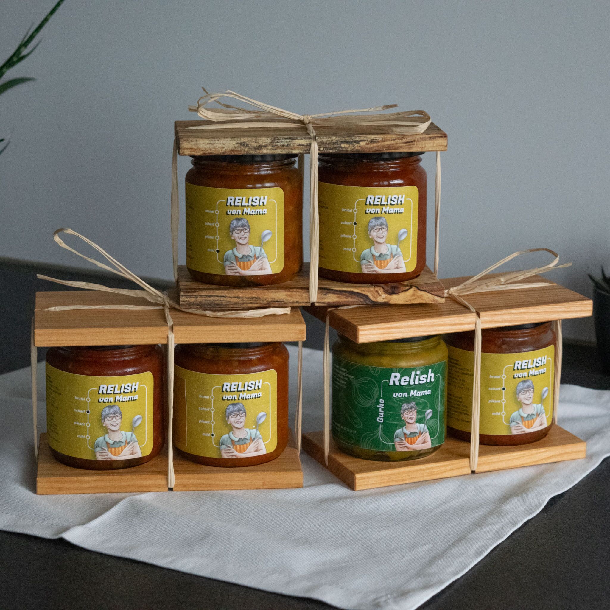 Wähle deine Lieblingskombination aus den vier köstlichen Relish-Varianten: mild, scharf, brutal scharf oder Gurke.